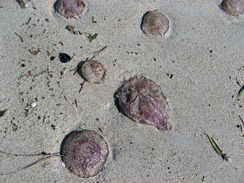 The photo was taken two weeks ago today. The beach of Cala Gran was laden with hundreds of the little creatures; the sea was awash with thousands more.