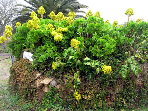 You’ll see the Aeonium Holochrysum plant just about everywhere in Mallorca. And right now, the green plant displays some beautiful, large, yellow, flowery clusters.