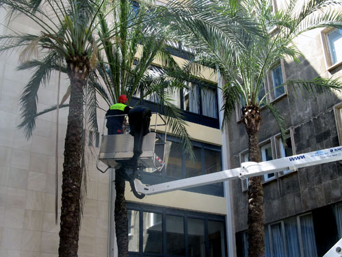 The man seen here had the professional tool, a sharp blade attached to a short handle to shave the leaves off the palm tree. His cabin-lift truck was impressive, too. Jardins de Ciutat seem to know what they are doing.