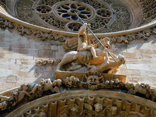 The photo shows a detail of the baroque façade of the Basilica de Sant Francesc in Palma de Mallorca, depicting Sant Jordi and the dragon.