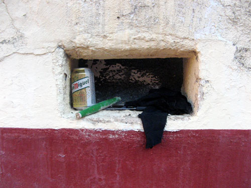 I went back to the Plaza de Toros in Felanitx the day after the last bullfight, and took today’s photo. If you look closely you can make out part of a banderilla, a knife, and some black objects, which in fact are such cut-off bull’s ears. It angers me somewhat that the whole fuss is about doing a good show and earning a supposedly well deserved trophy, only to find that the acquired trophy is then disregarded, discarded and thrown out. A little respect for the combatant, in this case the bull with the no. 100, 101, 109, 110, 111 or 115, would have been of the order, don’t you think?