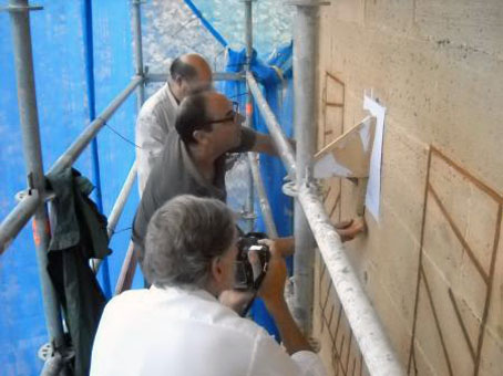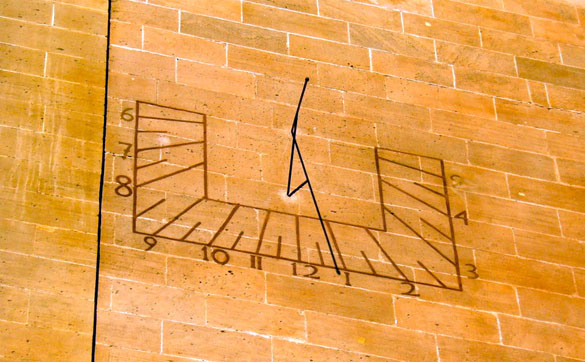 Anyway, the Esglèsia de Santa Teresa in Palma’s Rambla had recently a bit of restauration work done to its exterior. In the course of repair work and a thorough clean up, a rather large sundial was discovered on the church façade that was unknown to the authorities. The monochromatic hour pattern had faded away over the ages and the old style had vanished. Only the wet from the rain made the sundial discernable from close up. Ultraviolet lamps were used during the restoration process and the gnomon was replaced. Now this rehabilitated sundial gives us the time of day once again and in replenished style.