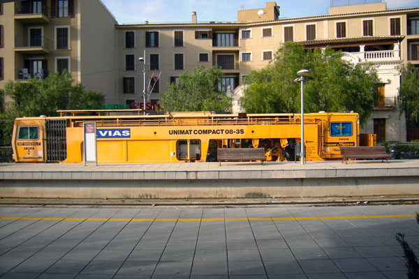 What we see here is a railway track maintenance vehicle, manufactured by the Austrian manufacturer Plasser & Theurer. The company manufactures an extensive range of machines including the Unimat Compact 08-3S shown here, and exports its output to a staggering 104 countries worldwide. I imagine that the maintenance vehicle is used for small repair jobs as well as for restorations and refurbishing of the railway track in Mallorca. Since 2004, all train services on the island are provided by Serveis Ferroviaris de Mallorca (SFM), with the exception of the connection from Palma to Sóller which is the responsibility of Ferrocarril de Sóller SA.