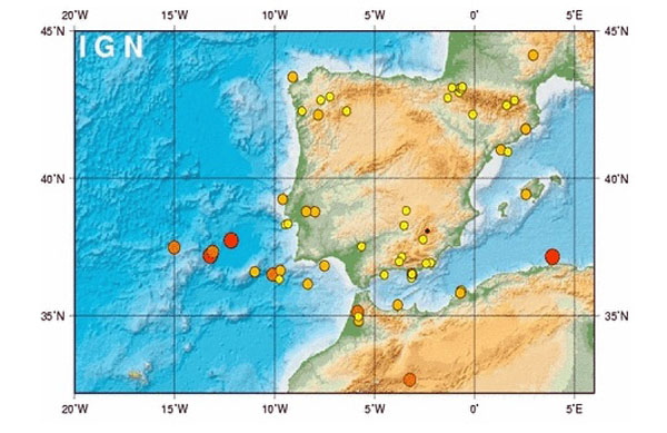 Spain’s Instituto Geográfico Nacional has an interesting website too. The image (below) was borrowed from it, showing in excess of 50 tremors during the last 10 days in Spain, the Iberian peninsula and in North Africa, with an intensity above 1.5 on the Richter scale. The last one recorded occurred near Caravaca, not far from Murcia, last night at 21h20, with an intensity of 1.7.