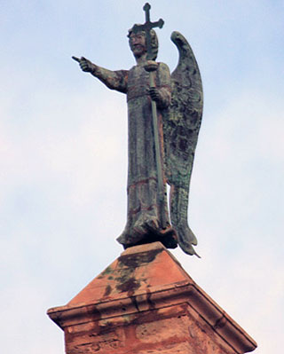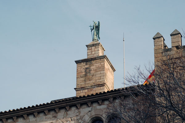 In the midst of the massive set-up that is the fortress-like Palau de l’Almudaina in Palma de Mallorca there is a tower which used to serve for matters of vigilance and also doubled as a dungeon, I imagine. The tower is known as the Torre del Ángel, also celebrated as Torre de Homenaje. The torre is adorned by a large sculpture cast in bronze representing Archangel Gabriel and probably acting as a lightning rod as well. The sculpture is the work of the artist Francisco Campedroni from Perpignan (France) and was created nearly 700 years ago in 1312, on the orders Rey Sancho, sovereign of the Regne de Mallorca. The Kingdom of Mallorca included all the Balearic Islands: Mallorca, Menorca, Ibiza, Formentera, Cabrera and Dragonera. The king was also, if you want to know, lord of the counties of Roussillon and Cerdanya and the territories Jaime I kept in Occitania: the signory of Montpellier, the viscountcy of Carlat in Auvergne, and the barony of Aumelas, contiguous to Montpellier. Thus, the angel’s artist’s hometown was part of Rey Sancho’s empire; in fact, Perpignan was the kingdom’s capital city. A rather large castle was situated there upon which the remodeling of the Almudaina Palace was fashioned.