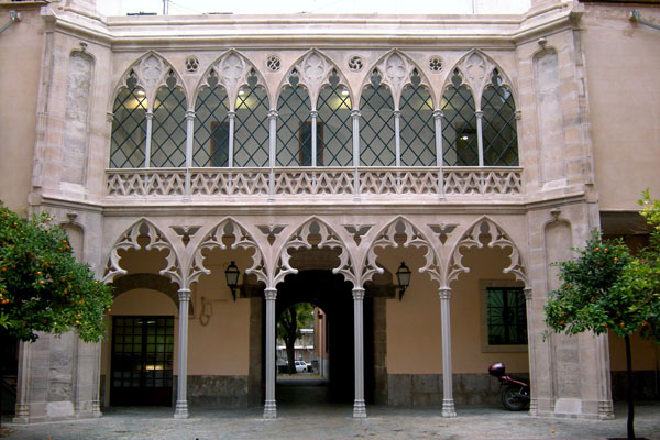Just before you enter the Esglèsia de l’Anunciació in Palma, also known as the Esglèsia de Sant Crist de la Sang, you pass the Hospital General as well as a small courtyard lined with Seville orange trees. The courtyard is lovely, peaceful and pleasing, not least because of a rather beautiful façade in the neo-Gothic style that you find behind your back as you enter the patio. Turn around and have a look.