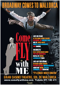 Come Fly with Me is also a musical spectacle starting its second year at the Gran Casino de Mallorca tonight, March 20th, at 21h30. In the show, Frank Sinatra is impersonated by Chris Mann. Performances are offered on a weekly basis from now until October 2010. Tickets are available at 30 €, 45 €, 55 € and 99 € by telephone (971.130.411) or online (comeflywithme.com).