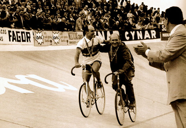 The photo shows Guillem Timoner (left) in the Velódromo de Anoeta in Donostia (Basque for San Sebastián) September 12th, 1965, doing his lap of honour. This was the sixth and last of the World titles for the cyclist from Felanitx, Spain’s first ever cycling World Champion.