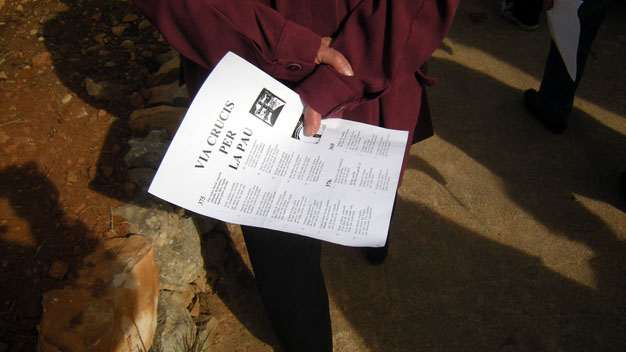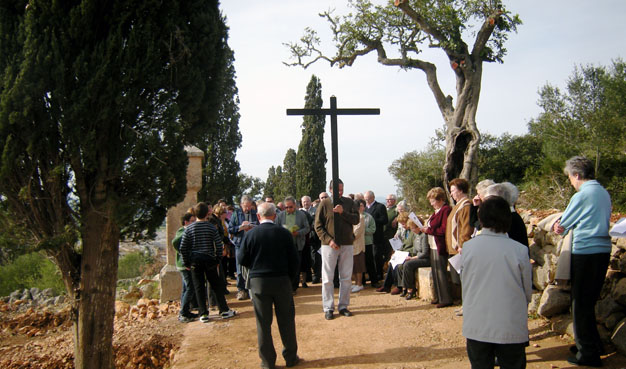 I went to participate in the Vía Crucis pilgrimage in Felanitx yesterday, up to the Puig d’es Calvari. Vía Crucis is the Latin name for the Way of the Cross or the Stations of the Cross, also known as Vía Dolorosa or Way of Sorrows. It refers to the depiction of the final hours of Jesus and the 14 Stations of the Cross that marked the legendary route of the Passion. The object of the stations is to help the faithful make a spiritual pilgrimage of prayer, through meditating upon the main scenes of Jesus’s sufferings and his ultimate death. It is probably one of the most popular devotional rituals in the Roman Catholic world. The pilgrimage may be done at any time, but most commonly, is done during Cuaresma (Lent), especially on Good Friday. In Felanitx, the occasion was celebrated on yesterday’s Palm Sunday as next Friday (Viernes Santo, Good Friday) is reserved for the big Davallament, the Felanitx Passion Play. Yesterday’s ascent to the Oratorio del Puig des Call came under the motto Vía Crucis Per La Pau (Vía Crucis for Peace). Whilst I applaud the peace message, I felt a bit of a fraud as I am not Catholic, not religious really, and couldn’t join in singing the hymns as the congregation stopped at each and every one of the 14 stations. I am glad I went, though. It was a joyous occasion meeting many of my neighbours on a gorgeously sunny afternoon. The work on the resurfacing of the camino was not finished, by the way.