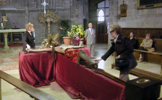 The church of the Anunciación in Palma is also known as the Església de la Sang. The church was built between 1487 and 1499 to accompany the Hospital General next door. The very popular church is distinguished for its Renaissance altar, dating from the 15th century, its Gothic Belén (nativity scene), dating from the 16th century, and its splendid Barroque chapel, housing the venerated Sant Crist de la Sang, dating from the 17th century. The Christ figure is made of wood from the cork oak. Nowadays, the crucified figure is usually presented behind safety glass, but once a year at Easter time, the Crist de la Sang is taken from the shrine and instead, is presented in front of the altar, as was the case yesterday (see photo). Today, Jueves Santo, the Crist de la Sang will be heading the Procesión de la Sangre, all the way from the Església de la Anunciació to La Seu, the Cathedral. During one such Maundy Thursday procession, in 2002, this Christ statue was attacked by an imbecile of an unsound mind and was severely damaged. Hence, after an extensive and costly restoration, the statue was safely put behind protective glass.
