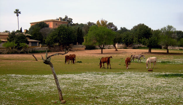 One of the finest houses in the vicinity of Ca’s Concos d’es Cavaller has to be Es Puig Gros, an impressive casa senyorial as ever you have seen. On approaching the estate, a flock of pavos reales (peacocks) start emitting their high pitched cries, alerting the proprietors of a possible intrusion. That’s what peacocks do naturally and that’s why peacocks are kept in Mallorcan country houses: to keep guard. In the fields below the estate, a dozen or so of the most beautiful Arabian horses graze, minding their own business, mostly mares and their foals.