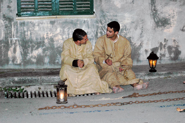 Last night, the Davallament was presented, a spectacle which has been performed annually since 1975. The show is a synopsis of the suffering, the death and the crucifixion of Jesus, ably directed by José Luís Fernández. The play is made up of five acts (Last Supper, Ecce Homo, Encounter with Maria, The First Fall, and El Davallament [Taking off the Cross]). The Passion play is always performed on the steps of the Església de Sant Miquel. After the performance, a procession involving all of Felanitx’s fraternities accompanies a statue representing Jesus Christ to the Església de Sant Agustí, where it is left, awaiting resurrection. The Christ figure will be brought back from Sant Agustí to Sant Miquel tomorrow, Sunday, where it will be reunited with a Maria statue in a rather moving procession that is called El Encuentro (The Encounter).