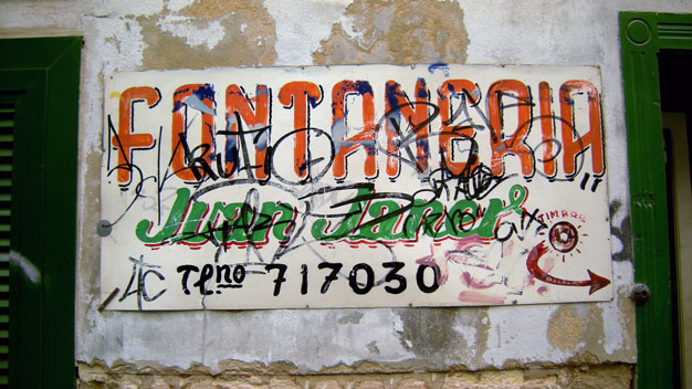 Totally unrelated to this chap in Manacor, I came across this plumber’s business in Palma de Mallorca, a week or so ago. This particular enterprise seems to still be a going concern but, by the looks of it, it may have seen its heyday. Only yesterday, this very Fontaneria was mentioned in one of the local newspapers as being in the process of a wind-down due to age related reasons. The telephone number on this shop sign gives it away; the 971 area code is not mentioned. Surely, this sign was painted many moons ago and would need a bit more than just a lick of fresh paint to stem the decay.