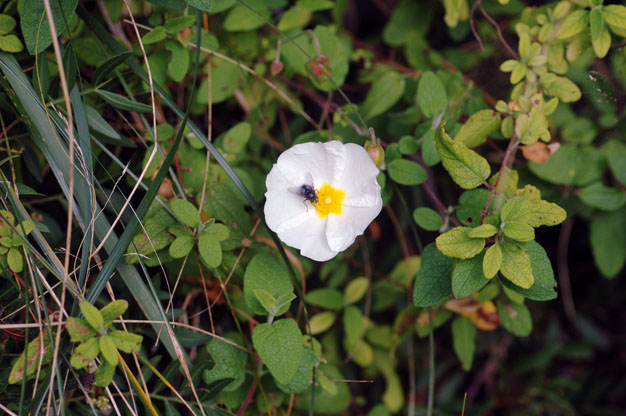 The Sage-Leafed Rock Rose (Cistus salviifolius) is also known as Sage-leafed Cistus, White Rock Rose or Salvia Cistus. This plant is an extremely variable species. It is not unlike the Montpelier Rock Rose that I have reported upon earlier, but this one has a larger flower and its leaves are not sticky. In fact, its leaves resemble those of a sage bush, even though they do not share its flavour nor are they edible. The plant grows in Mediterranean woodlands and in Garrigas so typical of Mallorca. The flower has a pleasant if subtle smell and is said to be used for the production of perfume. Its flower is simply pretty and seems very popular with the Mallorcan bees.