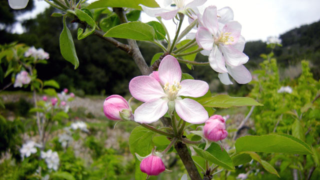 Yesterday, I could not resist taking this shot of a flowering apple tree (Malus domestica). There are innumerable varieties of this species, easily surpassing a thousand. I don’t know how many of these varieties one can find in Mallorca but, apples do grow in some regions of the Balearic Isles. Apparently, the apple tree shown here was grown from the seed of an English apple, would you believe it, and it is doing fantastically well.
