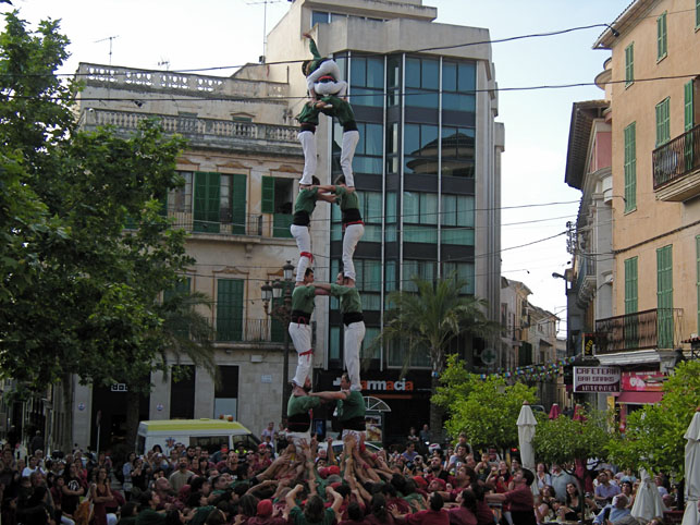 Yesterday, the 1er Tast comentat de Vins de Manacor took place, a sit-down wine tasting of 13 wines from the Manacor area, expertly explained by a sommelier. The Castellers associations of Al·lots de Llevant and Castellers de Mallorca were meeting to present some human tower building. Sadly, one of the human castles presented by the Al·lots de Llevant group (see photo), first started to wobble during the descent and then collapsed. Four or five of the top tiers’ performers fell onto the pinya, the man-made base of the castell. One of the participants hit the hard ground, though, and had to be rushed into Manacor hospital. Let’s wish the victim, a male in his thirties, a full and speedy recovery.
