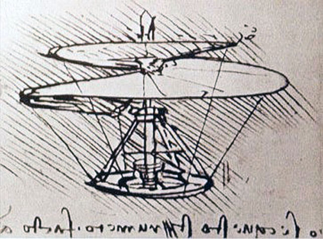 The first man ever to come up with the idea of an upward gyrating apparatus was probably Leonardo da Vinci (1452-1519), but his invention (see sketch; bottom) was never built during da Vinci’s lifetime and it certainly never flew, then. Frenchmen, Gustave de Ponton d’Amécourt, Enrico Forlanini and Emmanuel Dieuaide all designed models of unmanned helicopters during the 19th century which never flew on a life-size scale. According to Wikipedia, ‘Thomas Edison patented his own design for a helicopter powered by a gasoline engine with box kites attached to a mast by cables for a rotor, but it never flew’.