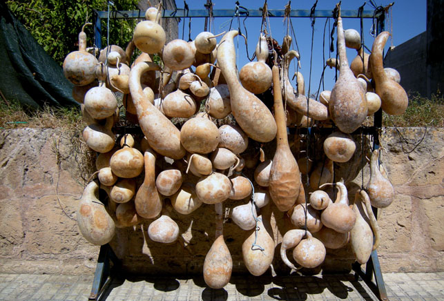 Cucurbitaceae is a plant family commonly known as gourds, marrows or cucurbits, and includes crops like cucumbers, squashes (including pumpkins), luffas, melons and watermelons. The Spanish call them Calabazas (Carabassa in Mallorquín) and they come in all shapes, forms and sizes, oblong, round, flat or compressed, crook-necked, large and small. All gourds and pumpkins grown in Mallorca are edible but, unfortunately, the fruit is not the staple food any longer that it once used to be. Instead, gourds are often used for decorative means, especially when they come in funny shapes and sizes, as shown here.