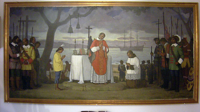 Fray Junípero Serra hails from the pueblo of Petra where a museum is established in the missionary’s name. The photo (above) was taken there. The image shows a painting by Joan Miralles Lladó and supposedly depicts Serra’s first landing in Monterey, CA. in 1769 and the first misa (mass) held there upon a successful disembarkation. The museum is open daily. A visit can be recommended.