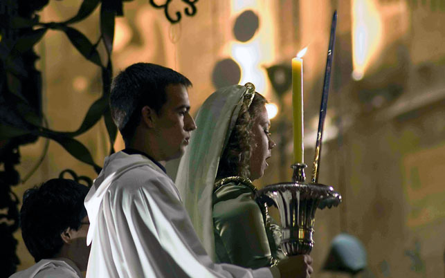 The chant of the Sybil is performed at matins on the night of 24 December in churches throughout Mallorca. The chant marks the annual Christmas Vigil, and is sung by a boy or girl accompanied by two or more altar boys or girls. During the chant they walk through the church towards the chancel, the singer carrying a sword in his or her hands, held upright in front of the face, while the altar boys or girls carry candles. At the end of the song a cross is drawn in the air with the sword. The versions of the chant performed on the island vary little from their Gregorian roots: each is sung a cappella with music between the verses provided by an organ. The costume worn by the singers usually consists of a white or coloured tunic, sometimes embroidered around the neck and hem, and often worn with a cape. The head is covered with a cap of the same colour as the tunic. The rite involves all the church parishes on Mallorca with old and young generations working side-by-side as singers, costume-makers, celebrants and other helpers, thus ensuring its transmission.