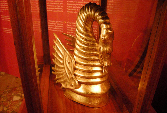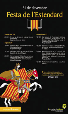 The last day of the year is celebrated in Mallorca as being the day when the last Moorish Valí (governor) in Mallorca signed an agreement of capitulation with the conqueror, King Jaume I of Aragon and handed over the keys to the island capital. It all happened in the year 1229 as I am sure you will know full well. Celebrations started in Palma yesterday and will continue tonight with a concert by the Banda Municipal de Música de Palma at 19h00 in Plaça d’Espanya, followed by a church service at 19h30 and an homage to the Conquistador at 20h00 (see programme, bottom). The main day and the finest of the celebrations will happen tomorrow, though, and that would be an event that I do recommend to you if you have not witnessed it before. The Estendard Reial de la Conquesta de Mallorca (the ceremonial banner), hoisted on a flagpole of a height of 6 m, as well as the Cimera del Rei Marti (the monarch’s Chimera helmet, see photo below) will be exhibited in Plaça Cort at 10h15 tomorrow morning, before Palma’s Mayoress, the President of the Consell de Mallorca, the President of the Govern Balear and whoever else have you, rush off to a missa solemne in La Seu (Cathedral). What you don’t want to miss is the celebration as they come out of the Cathedral at 11h30 and make their way in a procession back to the Cort (town hall) in full regal authority and pomp with white horses galore, with brass band and all the opulence of yesteryear.