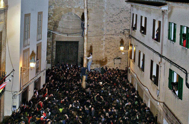 Two days ago, a huge 21 m pine tree was chosen and felled on the estate of Son Ternelles, the property of the heirs of the March family, near Pollença. Next Monday, January 17th, the large tree trunk will be hauled back into town at around lunchtime in a cheerful orchestration, involving the pueblo‘s younger generation, lots of Mezclat (a sweet and powerful alcohol concoction), plenty of xeremiers piping music plus the occasional fire rocket. The pine tree will be erected next to Pollença’s parochial church in Plaça Vella where it will be soaped before, on the evening at around 20h00, the male village youth will be competing to climb up the tree trunk to claim the trophy. The colourful proceedings should be televised live on TV, as always.