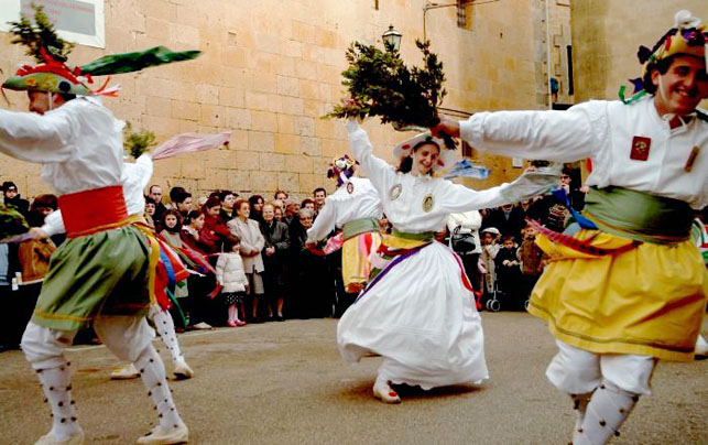 The main attraction of today’s festivities in Algaida will be the Cossiers dancers who have performed here, on and off, since 1554. At 11h00, everybody will go to the Yglesia, where the Cossiers dance merrily inside and outside of the church. The Cossiers perform their dance ritual with a male representing the female lead part. Another dancer is dressed as a demon and tries to spoil proceedings. Some sources trace the Cossiers to a Scottish connection; don’t ask me why. But phonetics would support that theory – Cossiers sounds just like escocès (Scottish). Cossiers dancers can also be found in other Mallorcan places such as Montuïri, Porreres, Pollença and Sóller.