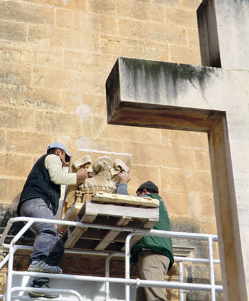 During a recent visit to Campos I discovered that the Spanish Ley de la Memoria histórica (Historical Memory Law) is, slowly but surely, being taken seriously in some small ways. On the side of the església parroquial de Sant Julià a Franquist coat of arms had been on display for the last seventy years or so above a war memorial remembering the victims of the battle between brothers during the years of the Guerra Civil. The old fascist symbol (see photos centre and bottom) was recently removed and a new Municipal coat of arms has now been put in its place (photo centre and top). Quite why the town of Campos should ever have elected the mythical bear as a heraldic symbol is unbeknown to me. I only know that Madrid has a bear as well in its city insignia.