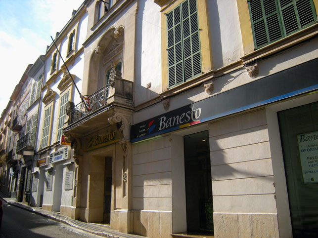 The bank was founded at the time of the town’s most prosperous period in 1883, with a capital of 636,500 pesetas, divided into 1,273 shares of 500 pesetas. The Bank remained active until it was incorporated into the Banco Español de Crédito en 1944. Today, the bank is known under the name of Banesto, ranking amongst the fifth-largest banking group in Spain (88 % of which are owned by the largest Spanish bank, Banco Santander). The building (photos top and centre) was erected in 1882 and inaugurated in February, 1883, at the occasion of the bank’s grand opening. The architect was Antoni Vaquer Noguera; the architectural style is an early example of Modernisme though the design is not quite as colourful or ornamental as that of its contemporaries.