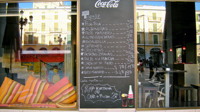 Tapas bars of fame in Palma are El Pilón, La Bóveda or Tast. Try to avoid touristy places like the one in my photo, in Plaza Major, unless you are a tourist. Be daring and try to order something that you have not had before; that way you will slowly but surely get to know a large range of Spanish tapas delights. Good places for excellent tapas are the Club Náuticas in Palma’s suburbs such as Portixol and Es Molinar, as well as the bars in Palma’s fishing port, the Muelle (Moll de Pescadors). Further afield, excellent but pricey tapas are served at Can Miquel’s in Ses Salines.