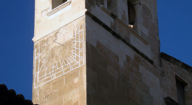 Outside of the church there is a sculpture of the cross of Sant Vicent dating from 1488. The campanario (bell tower) is graced by a large sundial possibly dating from 1775 (see photo below).