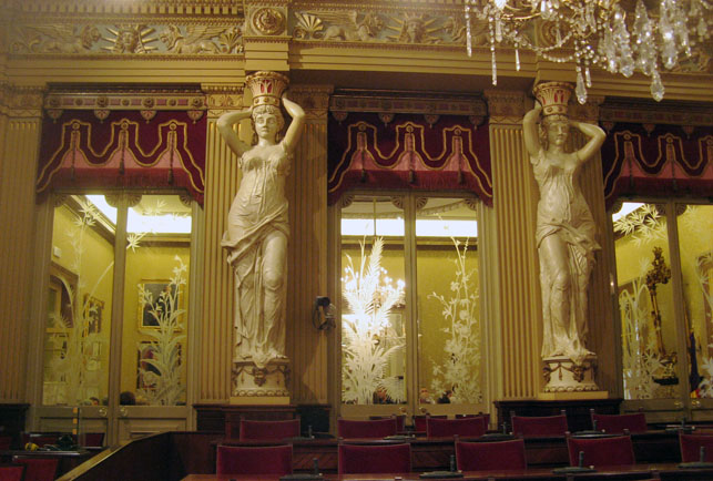 The parliament is housed in what used to be the Círculo Mallorquín building, a club for the upper-class social circles of Mallorcan society during the 19th and early 20th century. When the Illes Balears gained autonomous status in 1983, the building was acquired to house the new autonomous parliament. The erstwhile Salón de bailes y conciertos (ballroom) of the old Círculo Mallorquín is now the plenary assembly hall, a beautiful space which was originally designed by Mallorcan artist, Ricardo Anckermann Riera. The room also used to be called Sala de les Cariàtides in reference to the exquisite marble statues shown in my photo.