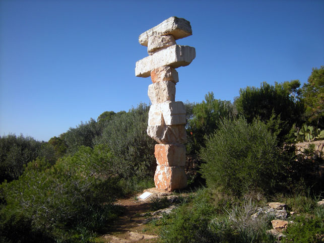 A number of large-scale works, mostly made of local sandstone, grace Mallorca’s south-eastern landscape. The most impressive one to my mind is a 6 m tall stele called Equilibrio (South) made of nine large, uneven blocks of Piedra de Santanyí, weighing in at a total of 10 tons. The sculpture forms part of a five-part series located by the artist in Santanyí (Mallorca, Spain, 1995), Cologne (Germany, 1997), Trondheim (Norway, 2000), Volgograd, the former Stalingrad (Russia, 2005) and Cork (Ireland, 2009), forming between them an imaginary axis cross or Meridians of Peace, as the artist has us know, spanning the European continent.