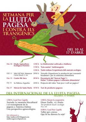 In fact, here in Mallorca this week is dedicated to the Lluita Pagesa i Contra els Transgenics. Via Campesina, a global organisation of small farmers and peasants, has declared April 17th an International Day of Protest against GMOs and patents on life, and campesinos in Mallorca will participate in their battle against GMO and in their concern for a dignified life for everybody.