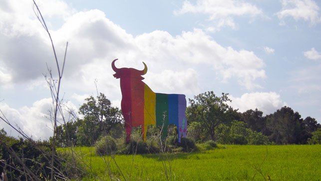 In Mallorca, as in Catalunya, the Osborne bull is not as welcome as in other parts of Spain. The Mallorcan cut-out toro often suffers from protesting graffiti (see my earlier blog entry). A couple of days ago, the billboard was defaced again but, this time in a cheerful manner. Now the black bull appears in the colours of the rainbow (see photo). Even though this colour spectrum is usually attributed to the Gay Pride movement, it is widely speculated that the latest toro misdeed was in fact carried out by the Spanish anti-bullfight movement who are known to have converged in Mallorca during the last few days.