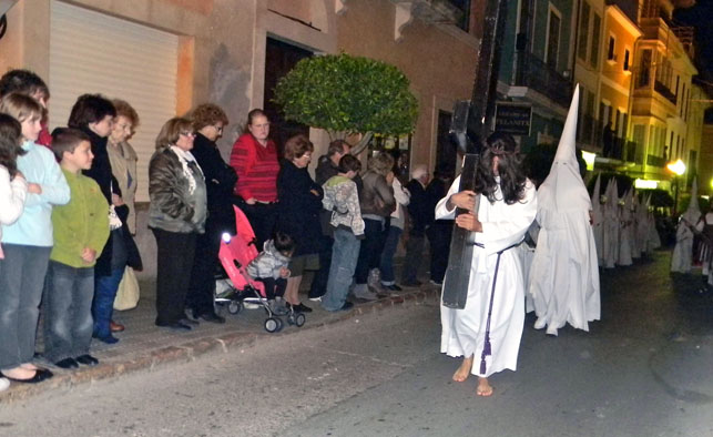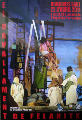 Last night, a Felanitx burgher represented the figure of Jesus and carried his own cross (photo above), albeit chronologically incorrect. Strictly speaking, Maundy Thursday or Holy Thursday would have been the day of the Last Supper, when Jesus would have been betrayed by Judas Iscariot into the hands of the chief priests. The bearing of the cross would have occurred a day later, on Good Friday. In Felanitx, however, Divendres Sant (Good Friday) is the day of the grand Davallament spectacle. Jesus will be crucified today, here in Felanitx, and later tonight, taken off the cross and buried.