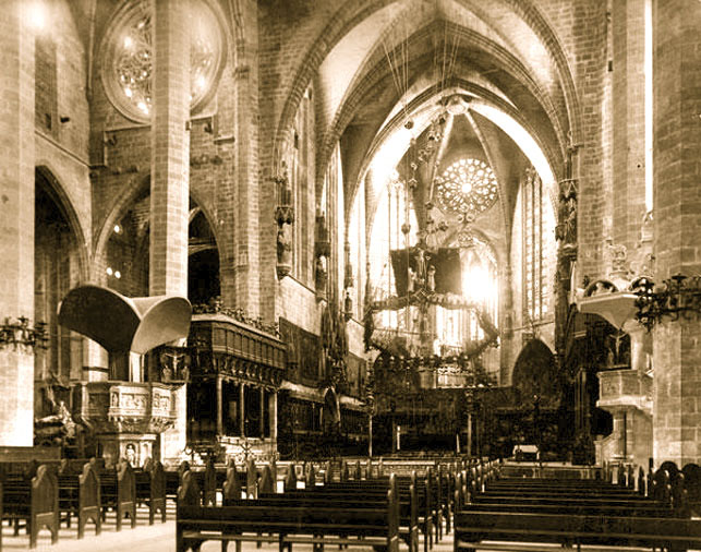In about 1903-04, or thereabouts, Antoni Gaudí designed an amazing contraption for the main pulpit of Palma’s Cathedral. At the time, microphones, loudspeakers or electric amplifiers were not invented, yet, and the bishop’s sermon could not clearly be followed during church services by all the devoted Mallorcans. The Tornavoz, a sounding board construction, was Gaudí’s answer to the Cathedral’s needs. The acoustic device was installed in 1904 and remained firmly in place until 1971. It was removed because, by then, microphones and loudspeakers could be installed in La Seu (the Cathedral).