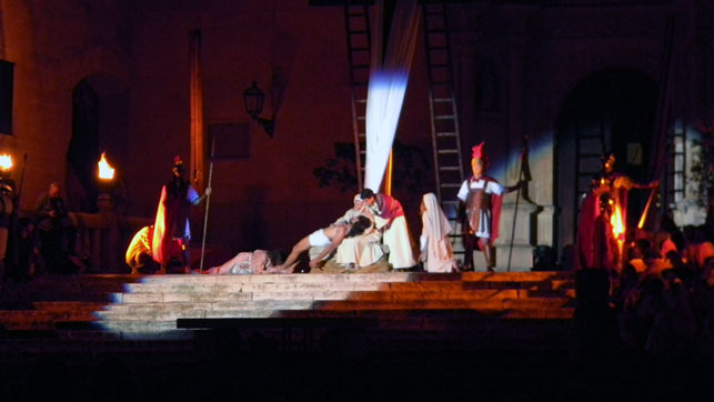 Good Friday celebrations centre around the Davallament, here in Felanitx, a performance of the Passion Play which has been staged, here, ever since 1975. The Davallament is the story of the Last Supper, the betrayal of Jesus by Judas, Jesus’ capture, his crucifixion, the taking off the cross of the dead body, the Pietà and, finally, the burial. All of this was staged two days ago in front of Sant Miquel, the parish church of Felanitx, except for the burial. After the act of the taking off the cross, the Processó de l’Enterrament proceeded from Sant Miquel under the participation of hundreds of hooded members of the local brotherhoods to accompany the statue of the dead Christ through the narrow streets of Felanitx, to conclude at the Església de Sant Agustí. There, in the convent church, the Enterrament (burial) was commemorated with great panache and gracefulness.