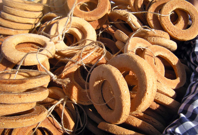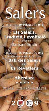 Two weeks after Easter, the Salers celebrate the successful conquest of the period of Cuaresma (Lent), the forty days before Easter when religious customs made it inappropriate to feast on meat or sweets. A Ball is celebrated, then, and was celebrated last Sunday, and Rollets were baked for the occasion, ring-shaped biscuits made from almonds. Yumm. Rollets are only ever offered that one day, once a year, and only in Felanitx. If you want to try some, you’ll have to wait until next year, two weeks after Easter Sunday, for the Ball dels Salers and their Rollets, and you’ll have to come to Felanitx.