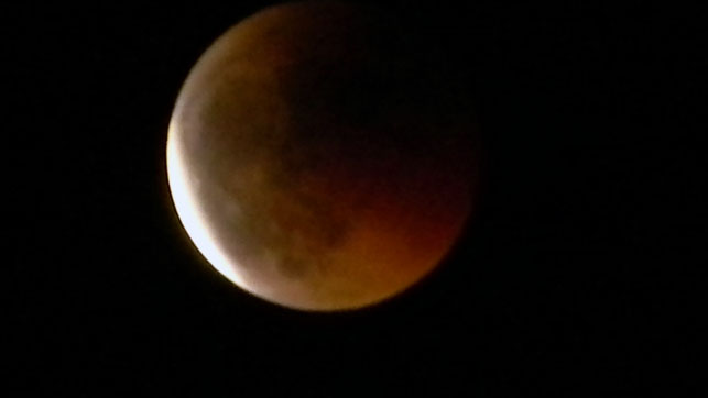 I went to a Full Moon Meditation Circle with my wife and some friends. We, all 19 of us, had a very good experience, sharing gratitude and affinity, closeness and avidity but no, we did not see the moon. We met at 19h30 in bright sunshine and saw the sun set behind the hills in the West about an hour later. By that time we had already started our full moon ceremony. The moon must have come up by 21h00. The lunar eclipse must have been starting at around 21h15, reaching a total eclipse of the moon by 22h15. Our ceremony finished at about 22h30. We never saw the moon until after we had said our good-byes and left. There, on the way out and to our cars, we saw the moon (photo top) just beginning to come out of its total eclipse and still a beaut to behold in all its blood orange shade of pale.