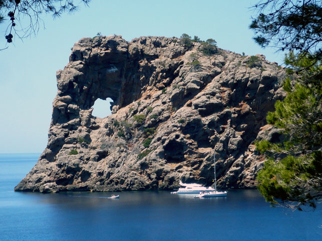 There are a number of rocks on the island with a hole in it. They are all called a Foradada (the pierced one). The best known and quite clearly the most stunning one is Sa Foradada near Deià, next to the Son Marroig estate, the erstwhile home of Archduke Luis Salvator, over in the Serra de Tramuntana mountain range. Unless you are a rock climber, you can’t actually get very near the rock hole but, from the parking lot and the bar, a footpath leads down to the sea level and a small beach, making for a nice little outing. It will take you about forty minutes to get all the way down, perhaps a bit less if you are younger and fitter than me, and perhaps 60 minutes to get back up again to your car. If you are lucky you might spot an eagle nesting high above the hole, or is it a Red Kite (Milvus milvus)?