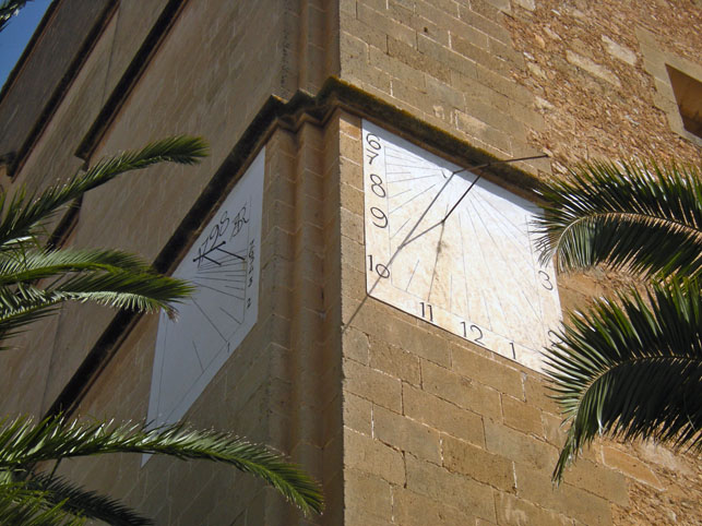You will find that in Mallorcan pueblos it was quite common to rebuild and replace their parish churches over the centuries. Normally, the new church outclasses the previous one in size and splendour. The Esglèsia Parroquial de Nostra Senyora de la Consolació in Porreres is a case in point. This church dates from the late 17th century and was inaugurated in 1714, replacing a previous one from the 15th century which in turn had replaced a smaller one from the 13th century. The size and the opulence of today’s parish church are evidence of the town’s affluence in times gone by. The church organ was built by Lluís Navarro during the 18th century; is famed for its clean sound, helped by the church’s good acoustics and a recent restoration in 1982. Outside, one finds the unusual design of a two-faced sundial with a 90 degree angle between the two faces (see photo), dating from 1798, one facing South and the other, facing West.