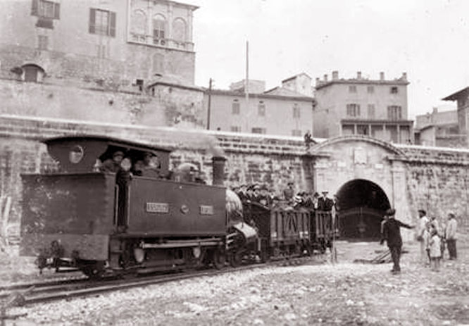 The first train line between Plaça d’Espanya and the Port de Palma was built overground in 1874 and inaugurated in 1877. Initially, the goods trains were pulled by horses (see photo centre); after 1881 they were pulled by steam engine locomotives (see photo bottom). The underground line was built in 1928 and put into service in 1931, extending to a length of 2,046 metres of which 1,252 metres were subterranean. The underground train service for merchandise was discontinued after 1965; after that the goods service continued overground once again.