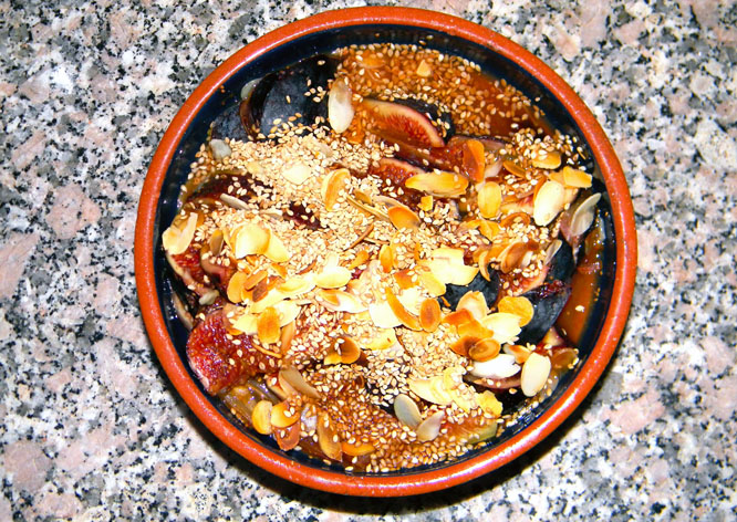 Mix the fig pieces with the dates and the orange juice in a serving bowl; add the honey and the rosewater. Refrigerate for two hours until serving time. Before serving, sprinkle with a generous helping of toasted almond flakes and sesame seeds. The fig and date compote serves 4. Enjoy.