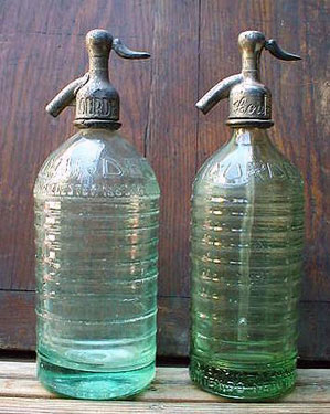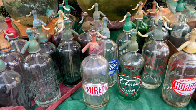 There was a time not all that long ago when, here in Mallorca, some 130 soda bottlers fabricated their own carbonated soda water. Each one of those would be the proud proprietor of their very own siphon bottle. Those bottles were produced in thick, heavy glass and carried their individual, stark design, often influenced by the style of the Twenties or Thirties. When, during the Fifties and Sixties, the occasional siphon bottle would explode and possibly cause injuries to the bar tender, Mallorcan siphon bottles were encased, first with straw and later, with a plastic apron which, in my opinion, lead to the demise of the siphon bottle, here in Mallorca. In 2011, there are but two or three soda water bottlers on the island. Today, the siphon bottles are usually made in firm plastic. Ghastly, if you ask me.