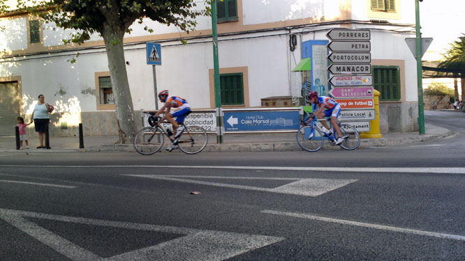 Every year, on the occasion of the Festes de Sant Agustí, the town of Felanitx holds a Cursa Ciclista (a mini Tour cycling race) over 50 km on an urban racecourse, and so again yesterday. Guillem Timoner did not participate, age 85, but came to watch the new generation of cycling enthusiasts of which Felanitx has so many. The race was staged in two age groups, adults (shown here) and adolescents. I was pleased to see that in the latter category there was also a female, or were there even two? Sometimes you cannot tell the gender as the cyclists whizz past the onlookers, generating quite a bit of a whoosh. It’s actually quite hard to get the action on to film, as it were.
