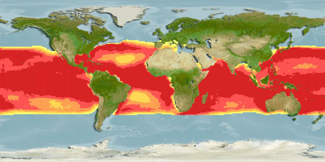 A week ago (August 25th) was the first day when commercial fishing of Llampugas (Common Dolphinfish; Latin: Coryphaena hippurus, also: Lampugus siculus [Valenciennes]) was allowed. If you go for this Autumnal fish as a private person, you would be allowed to go for the fish at any time here in Mallorca as long as you are in possession of a valid fishing license. As a professional fisherman, however, you would be restricted to the official season which goes from now until the end of November. One can already find Llampugas in some of the fish markets on the island. The Llampuga is a migratory fish, usually at home in the Atlantic where it can grow up to a size of 2 m but, also at home in the Pacific and the Indian Ocean (see map below). Prices for Llampugas at Mallorcan fish mongers seem up on last year, possibly due to it being early days and availability still being scarce. Once everybody catches enough of the fish, prices should come down to their usual affordability (around 8 €). Some people claim that the Llampuga is also a farmed fish but, I have no evidence of any farmed Llampuga, here in Mallorca.