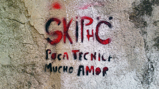 It seems that Skiphö is a band based in Andratx. One of their videos on Youtube starts with the making of a graffiti which is similar in some way. They use a stencil that’s why the ö is open. Regarding their music I guess the statement is a joke.