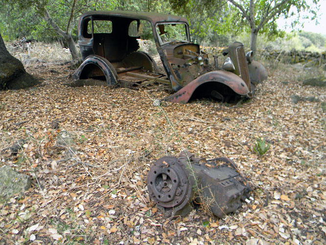 Yesterday, on one of my numerous rambles through Mallorca’s back alleys, I came across another unexpected find. The wrecked car shown here is not a Tin Lizzy which would have been the Ford Model T (built between 1908 and 1927). A Ford it is alright but, I would rather make that the Ford Model B, also known as Ford Model 18 (built 1932 – 1934).