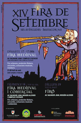 The photo (top) was taken at the Fira de Setembre in Manacor. The market comes under a Mediaeval theme, but, again, I cannot recommend a visit there. The Fira will continue today and tomorrow, Monday, but I think you would be better off at the beach, weather permitting. Or else, you could go to Binissalem and watch the Concurs de Trepitjar Raïm (Grape Treading Competition), at 17h30. Regarding the weather, there is a Yellow Alert for today, with a forecast of heavy and torrential rain. The Gota Fría, perhaps?